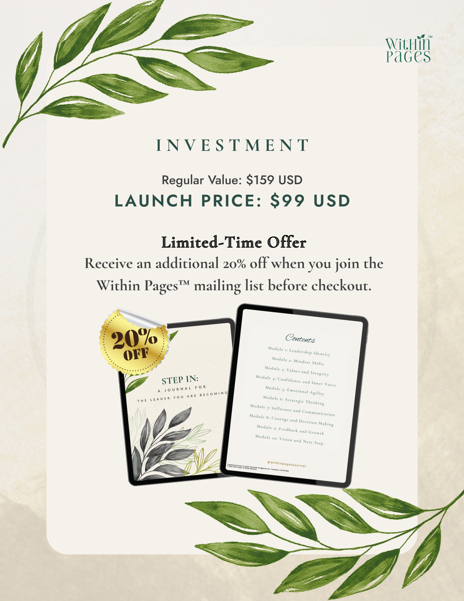 Limited-Time Offer: Receive an additional 20% off when you join the Within Pages™ mailing list before checkout.