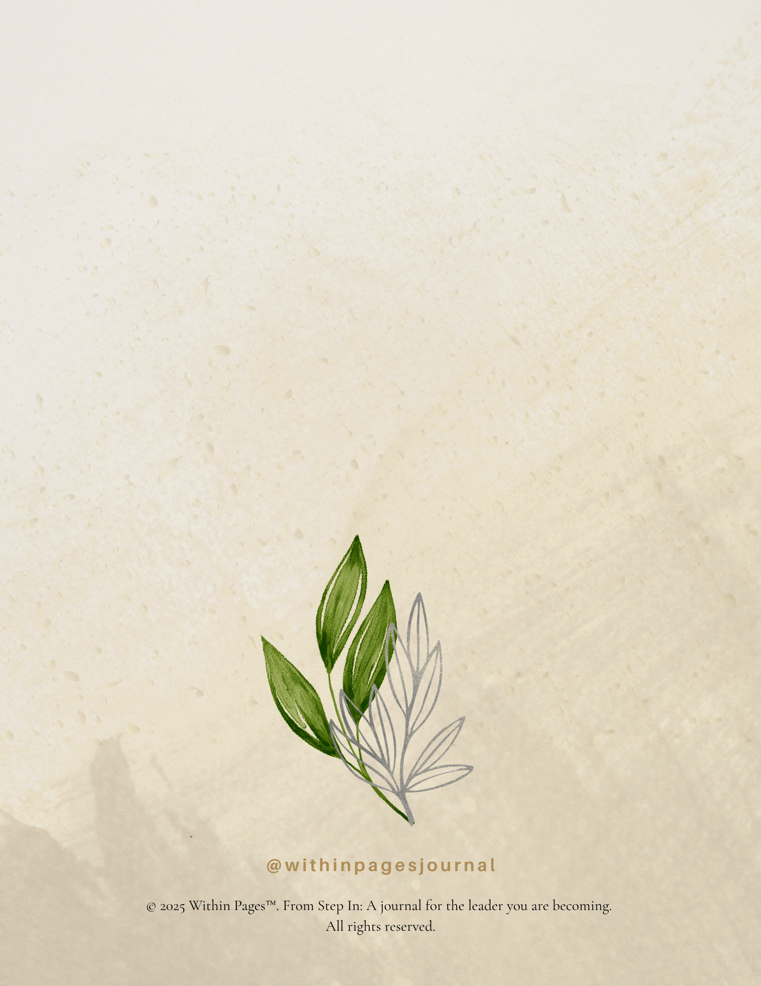 Step In helps you establish a sustainable leadership practice, one grounded in presence, reflection, and action. By working through the pages, you’ll uncover insights, identify what matters most, and strengthen the habits that enable you to lead with clarity and care.